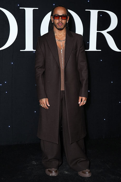 В этот раз его наряд оказался вполне сдержаным, особенно в сравнении с тем, как Люис наряжается на некоторые гонки. Широкие брюки и длинный пиджак, вязаный свитер с глубоким вырезом и кроссовки на платформe; все – в бежево-шоколадной гамме. Идеально для показа мужской коллекции Dior.