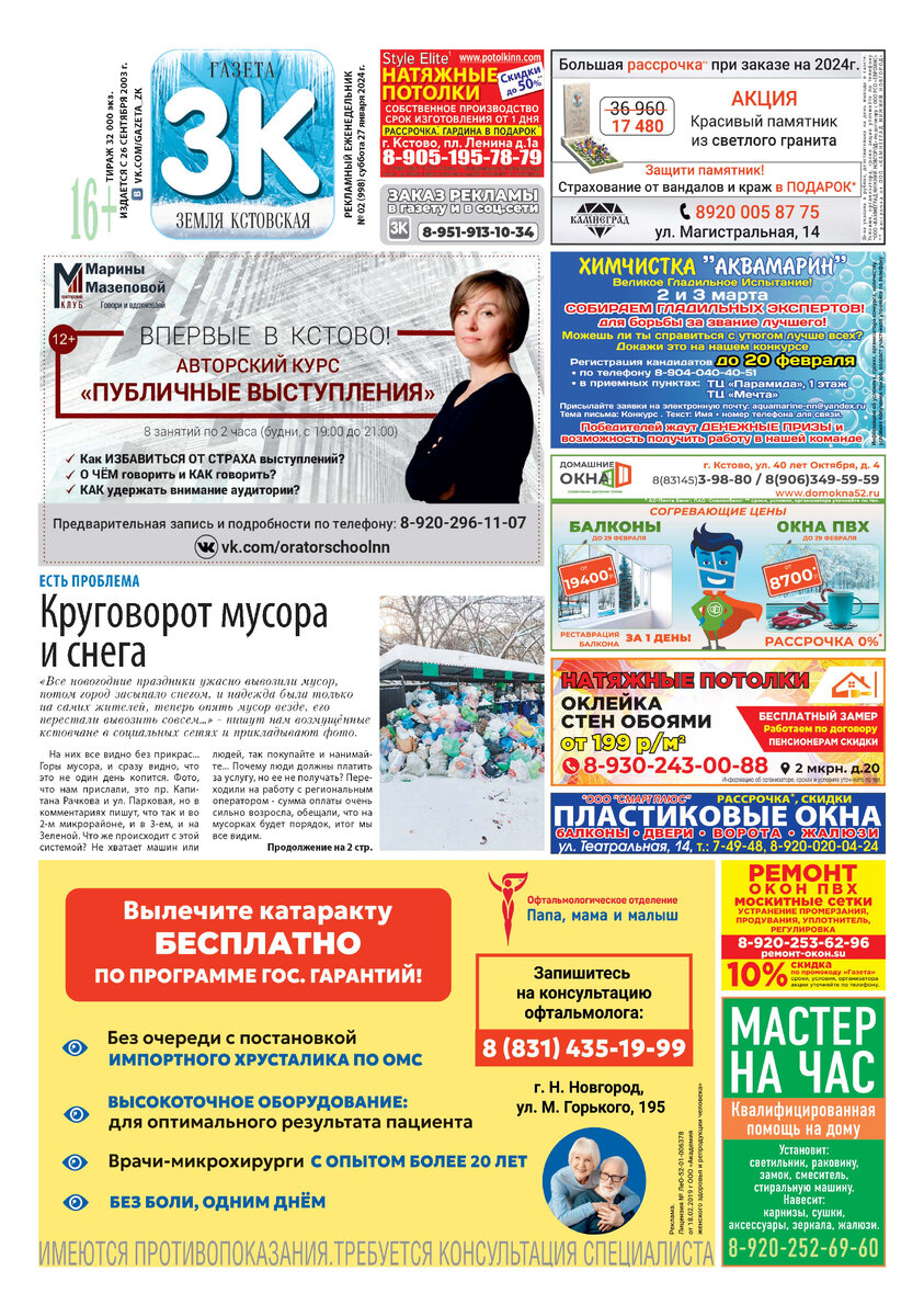Газета "ЗЕМЛЯ КСТОВСКАЯ"№ 2 (998) от 27.01.2024г.