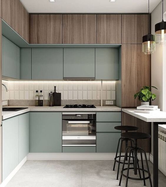 Очень популярно будет сочетание древесины (как светлой, так и темной) с этими модными оттенками.