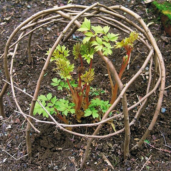 Многие растения нуждаются в поддержке. Чтобы не разваливались пионы, флоксы, рудбекии, другие цветы их приходится подвязывать. Обычно используют различные колья или декоративные опоры. Но, оказывается, все можно сделать гораздо проще и практичнее. Потому что прутья, воткнутые в землю и образующие полусферу, вообще ничего не стоят. Природный материал всегда смотрится более органично, чем металлические трубки или шпагат. А на будущий год опору можно сменить.