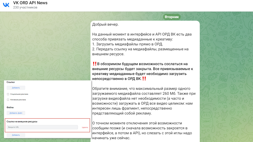 23 января 2024 года канал VK ORD API News сообщил: В обозримом будущем возможность сослаться на внешние ресурсы будет закрыта. Все привязываемые к креативу медиаданные будет необходимо загрузить непосредственно в ОРД ВК Что это значит Сейчас в ОРД ВК есть возможность загрузить большой медиафайл (или много медиафайлов) в облачное хранилище, открыть доступ к файлу (файлам) по ссылке и добавить эту ссылку в поле "Ссылки на внешние ресурсы". С точки зрения передачи данных в ЕРИР это не совсем верно, так как ОРД должны хранить данные креатива, а файлы из облака ОРД ВК не хранит. Видимо это и стало причиной отказа от данного функционала. Чем это нам грозит Максимальный размер одного загружаемого медиафайла в ОРД ВК составляет 260 Мб. При этом требования ЕРИР к видео (чуть ниже будут), если мы рассматриваем видеоформат, рассчитаны примерно на 4,5 минуты видео по данным ОРД ВК. Если у нас в ролике короткие рекламные вставки - проблемы нет. А если у нас ролик 10-15 минут, и полностью рекламный?