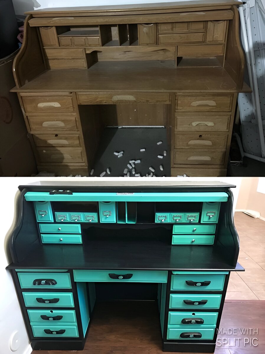 В каждой квартире или доме появляется мебель и вещи, которые со временем устаревают и совершенно не вписываются в современный интерьер. В этой статье мы продемонстрируем по истине единственные в своём роде образцы восстановленной мебели, которые послужат наглядным примером того, что нет ничего невозможного, или даже вдохновят вас заняться увлекательным процессом реставрации. 1. А начнём с вот такого винтажного и функционального стола. Хоть время и не щадит никого, но выглядит столик ещё не так плохо. Однако всегда можно сделать лучше, что автор-умелец и осуществил. Бирюзовый цвет «Тифанни» в сочетании с чёрным очень сильно изменил его внешний вид. Такой контраст может быть по душе не каждому, но смотрится очень впечатляюще и новомодно. Это ещё раз доказывает, что даже старая и покосившаяся мебель может превратиться в ценный элемент дизайна при правильном подходе. 2. Назовём их две тумбочки «неразлучницы». В этом случае реставратор ушёл в винтажный стиль и, как мы видим, благополучно.