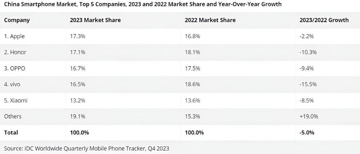 Apple продолжает праздновать свои успехи в продажах. Недавние данные указывают на то, что гигант из Купертино опередил Samsung по глобальным объемам продаж смартфонов в 2023 году. Однако на китайском рынке у Apple была не простая ситуация после выпуска iPhone 15. "Возрождение" Huawei с их китайскими чипсетами привело к снижению продаж Apple. Согласно порталу "Counterpoint", продажи iPhone 15 упали на 4,5% по сравнению с продажами iPhone 14 за первые 17 дней. Тем временем, линейка Mate 60 превзошла продажи новых iPhone от Apple: через шесть недель после дебюта Huawei продала 1,6 миллиона единиц. Honor, еще один серьезный конкурент Apple в сегменте премиум-смартфонов, также показал значительный прогресс благодаря своей всеобъемлющей стратегии продуктового портфеля. Тем не менее, данные IDC показывают, что Apple заняла первое место в Китае в 2023 году, и это было достигнуто благодаря своевременным рекламным кампаниям для линеек iPhone 15 и iPhone 14. Это первый раз, когда Apple превзошла