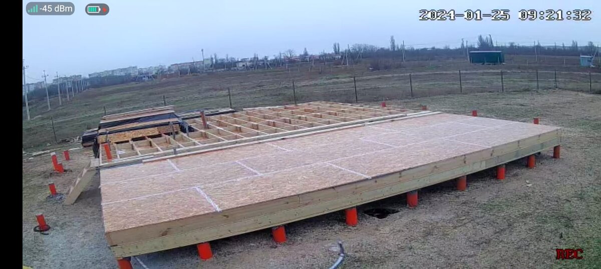 Январь подходит к концу, а стройка движется очень медленно. Погода совсем не даёт работать. Лаги пола собрали, внутрь вложили ОСП 12мм. Теперь нужно утеплять и сразу закрывать. Выдалось несколько дней без дождя, но температура была около нуля и внутри каркаса остатки снега никак не хотели таять. Пришлось убирать его в ручную. Успели в треть перекрытия подготовить основание, уложить мембрану, засыпать эковату, закрыть пароизоляцией и уложить ОСП 15мм. Стыки проклеили скотчем. И снова пошёл дождь. Снова ждём хорошей погоды, чтобы немного просохло и можно было продолжить сборку перекрытия. Электричества в микрорайоне до сих пор так и нет. Подрядчики должны устранить какие-то недоделки своей работы, после чего линию запустят и после этого уже РЭС будет подключать оставшиеся участки. Когда всё это будет никто не говорит. Опять режим ждуна. Тем временем наше ТСН не спит, сделали межевание дорог, начали потихоньку отсыпать щебнем. Через пару дней вроде обещают несколько дней без дождя, наде