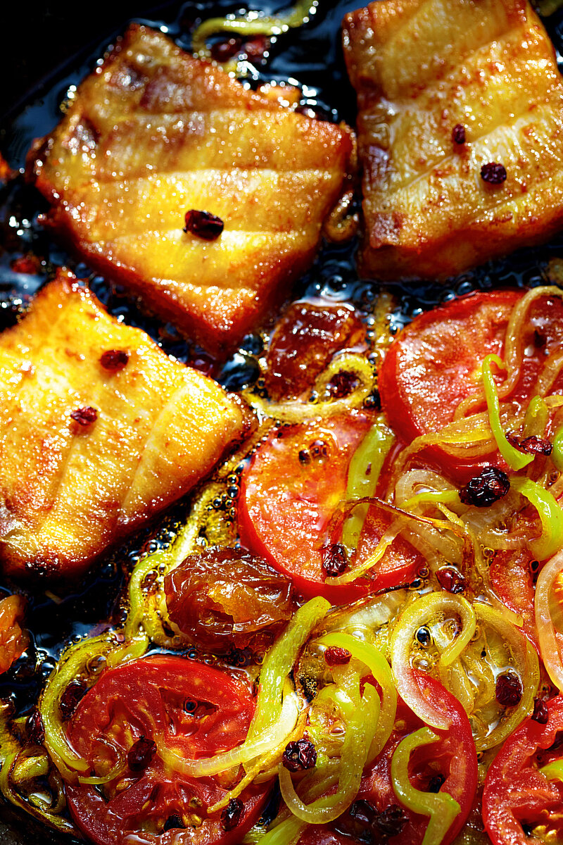 Смажьте рыбу пастой из алычи, поджарьте. Отдельно в большой сковороде поджарьте картофель, лук, перец и альбухару. Добавьте порезанный кружками помидор и измельченную петрушку, посыпьте сверху барбарисом и жарьте до готовности примерно 20 минут.