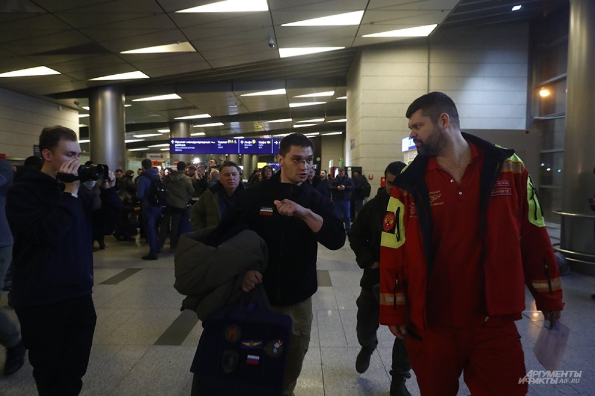 Все собравшиеся с нетерпением ждали одного: когда же наконец они смогут увидеть своих родных. И вот вскоре в терминал вывезли пилота Дмитрия Белякова. Мужчина находился в инвалидном кресле, губа рассечена. Ноги пилота плотно забинтованы.