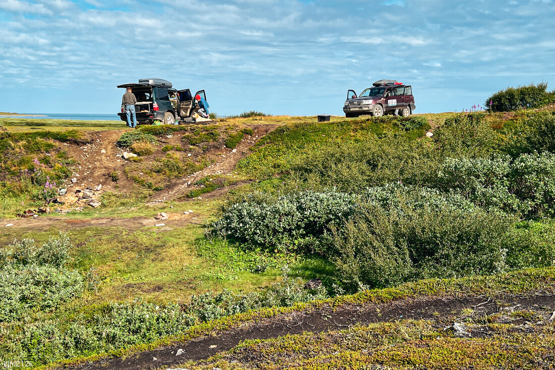 11 утра, сворачиваем лагерь в Скорбеевской губе и собираемся ехать дальше на восток. От вчерашнего шторма ни следа, опять прекрасная солнечная погода. Дорога сразу поползла в горку. Остановились у родника набрать питьевой воды. Отсюда хорошо видно всю Скорбеевскую губу. Дорога сразу поползла в горку. Остановились у родника набрать питьевой воды. Отсюда хорошо видно всю Скорбеевскую губу. Утесы на северо-западном конце губы. Мы стоим на такой же горке на противоположной стороне. Последний взгляд на Скорбеевскую губу и едем дальше вдоль северного берега Рыбачьего к следующей губе - Зубовской. Дорога стала заковыристей и каменистей. Но и количество людей упало в разы, встретили только две машины навстречу. Похоже, у Скорбеевской турпоток останавливается и дальше мало кто забирается. Дорогу то и дело преграждали реки, но броды везде неглубокие, проезжабельные. Основную опасность представляли камни в воде, поэтому каждый брод сначала проходили ногами, высматривали