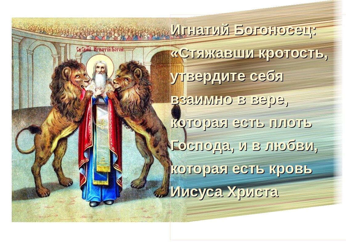 Игнатий Богоносец: стяжавши кротость, утвердите себя взаимно в вере, которая есть плоть Господа, и в любви, которая есть кровь Иисуса Христа