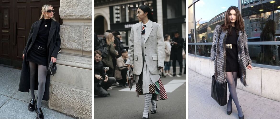 Удачным будет сочетание светлых серых колготок и черного платья длины мини или до колен. Чтобы образ был более гармоничным, дополните его с помощью серого пальто. А вот туфли должны быть в тон платья.