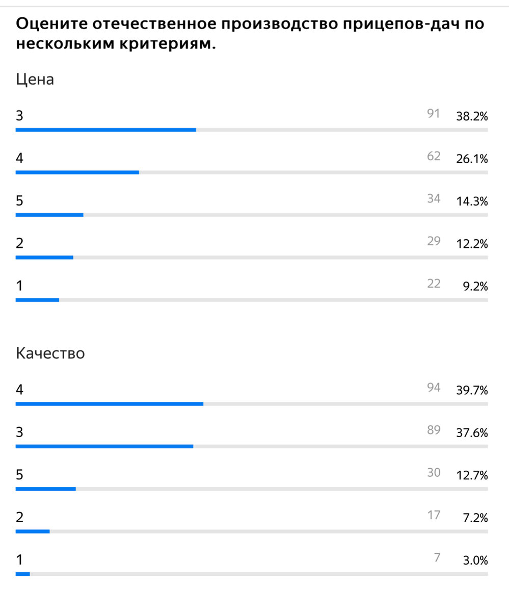 Мы спросили у владельцев и интересующихся покупкой домов на колесах что они думают о российском производстве кемперов по шкале от 1 до 5, где "1" значит что они недовольны, а "5" - довольны полностью. Цена Первый скрин-шот с результатами показывает, что большинство (38%) считают, что цена и не сильно высокая, и не сказать чтобы низкая. 26% посчитали, что цены хорошие, а 14% посчитали что цены на российские автодома отличные. Недовольны ценами чуть больше 20% опрошенных. Честно говоря, по тем комментариям которые мы получаем к обзорам российских автодомов, казалось что зрители очень недовольны ценами и считают их крайне завышенными. Но, как известно, люди скорее пишут плохое чем хорошее когда вопрос заходит о спорных вещах. Похожие оценки получило и качество наших изделий. Дизайн опрошенные оценили немного прохладнее. Оценок 3 и 4 чуть меньше, а двоек и "колов" побольше. Но и тут мы были приятно удивлены результатами. Оказывается дизайн у нас неплохой делают и резко негативных оценок