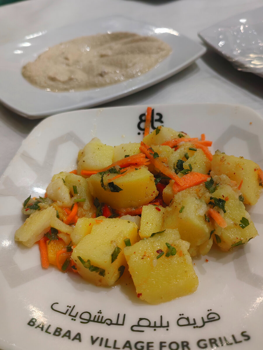 Расскажу чем нас кормили в ресторане . Начало про ресторан тут: Обслуживание моментальное . К столу сразу бегут несколько официантов с тарелочками, на которых мезза-мариноване овощи, макалки, отварные овощи. Это салат картофельный. Отварной картофель , тертая морковь, куркума для цвета , немного зелени и уксус. Маслом такие "салаты в Египте не поливают Айиш шами-лепешка из стран Леванта. Шам-это страны Леванта. Очень популярная лепешка-пита из белой муки. Баклажаны тушеные с томатами. Не все закуски я смогла сфотографировать, как нас было шестеро и мы сидели за длинным столом. Но конечно был соус дзадзыки, маринованные огурцы, бабануг, тахина, хоммос легкий белый сыр, свекла . Принесли мясо Это был шашлык из говядины, люля -кебаб из говядины, говяжьи рёбрышки и тарб-, говяжий фарш, скатанные в маленькие колбаски, завернутый в бараний сальник и жареный на гриле . Еще нам вынесли две фаршированные курицы гриль Внутри был рис басмати с куркумой и индийскими пряности. Общаться нам межу