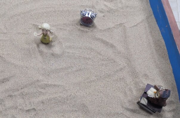 Демовизия практики На сессии психолог (далее супервизантка), заканчивающая обучение на долгосрочной программе. Для сертификации необходимо написать сертификационную работу с описанием трех случаев долгосрочной терапии. Испытывает сильное сопротивление и никак не может приступить к написанию данной работы. Запрос на супервизию: Разобраться, что за сопротивление? Что останавливает? Ψ Супервизор предлагает: «Выбери все, что тебе откликается на твой запрос и создай композицию в песочном подносе». Девочка - это супервизантка. Сова с кипой книг - это кейсы. Часы - это препятствие. Больше всего внимания к часам. Отношение к своей фигуре: «с одной стороны - рада, что девочка, с другой - осознаю свой возраст в терапевтической практике. Как будто, она не способна написать такие «труды»». Фигура углублена в песок: хочется больше опоры. Образ «Сова с кипой книг» - вызывает много чувств, потому что книги толстые и символизируют сертификационную работу: нужно много знать, все-все скомпоновать, сдела