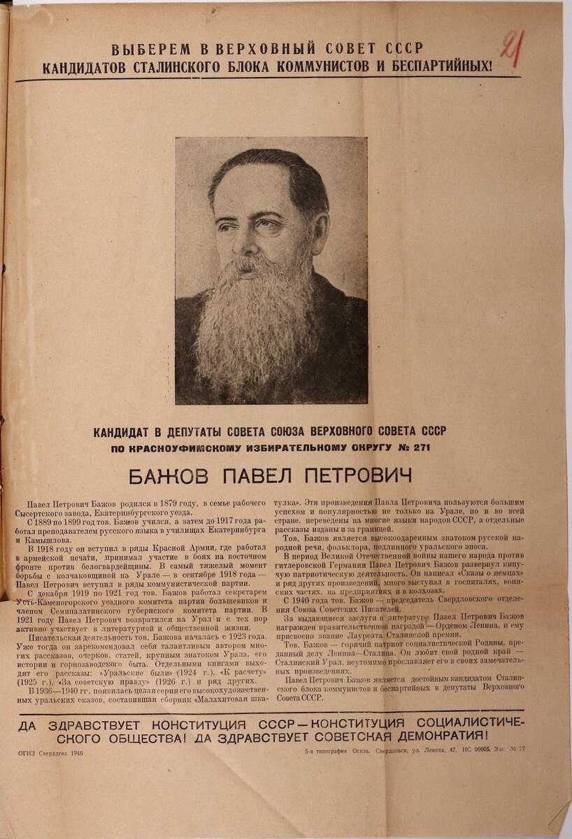 В феврале 1950 года, когда проходили встречи кандидатов в депутаты Верховного Совета СССР со своими избирателями, П. П. Бажов, депутат от Красноуфимского округа, опять там же выдвинутый кандидатом в депутаты нового созыва, приехал в Красноуфимск. Он остановился в городской гостинице. Находясь в Красноуфимске по делам службы, я жил в той же гостинице. Днем, когда я зашел в комнату, занятую Павлом Петровичем, то застал у него нескольких работников горкома КПСС, горисполкома, знакомых, вернувшихся с ним из городского клуба, где состоялась встреча с избирателями-железнодорожниками. Здесь же были представители колхоза, куда должен был вскоре выехать Павел Петрович на встречу с избирателями. Дым стоял столбом, все курили без стеснения, так как знали, что скоро покинут комнату. Павел Петрович тоже курил, беспрестанно кашлял и оживленно говорил. Настроение у Бажова было приподнятое, но все же вид был нездоровый, чувствовалось, что он хворает, хотя это нисколько не мешало ему вовлечь всех присутствующих в общую беседу.