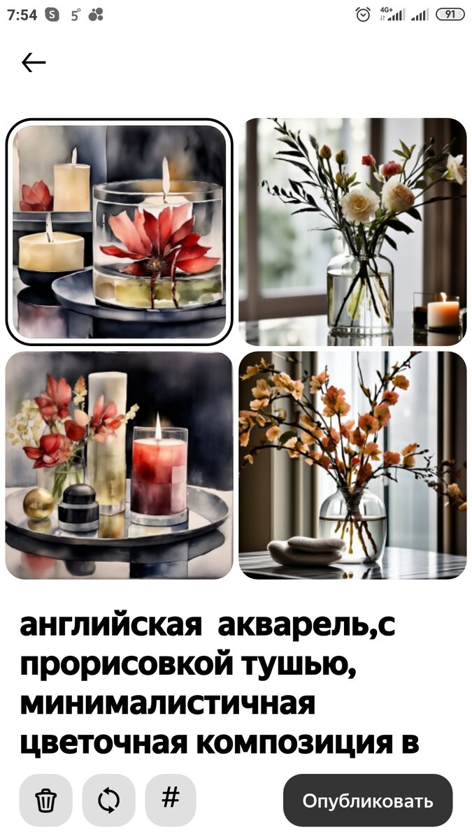 Внизу приведен пример запроса ( не мой,если что). "Английская акварель,c прорисовкой тушью, минималистичная цветочная композиция в стакане,туманное отражение в зеркале, красота современного СПА,бокэ,в тёплых красных, фисташковых молочных и золотых оттенках на чёрном мраморе,угольно чёрный фон,белые махровые полотенца свертками,брусок цветочного мыла, пиала с водой, лепестки,крупный план,высокое качество, реалистично, высокая контрастность,внимание к деталям,темнота, таинственный свет аромасвечей в темноте,много деталей,текстура бархат" И вот что получилось. Четыре варианта. Можно выбрать любой или переделать. Очень красиво. А вот что получилось у меня при моей безграмотности в этой нейросети. Ну и стих нейросеть по моему запросу тоже придумала. Текст в запросе такой: И вот что вышло. Довольно прикольно. Можно сказать теперь так: я сочинила. Короче, играть не переиграть с этой нейросетью. Вы заметили,что запрос должен быть многогранным,точным,описательным, многословным? И тогда не
