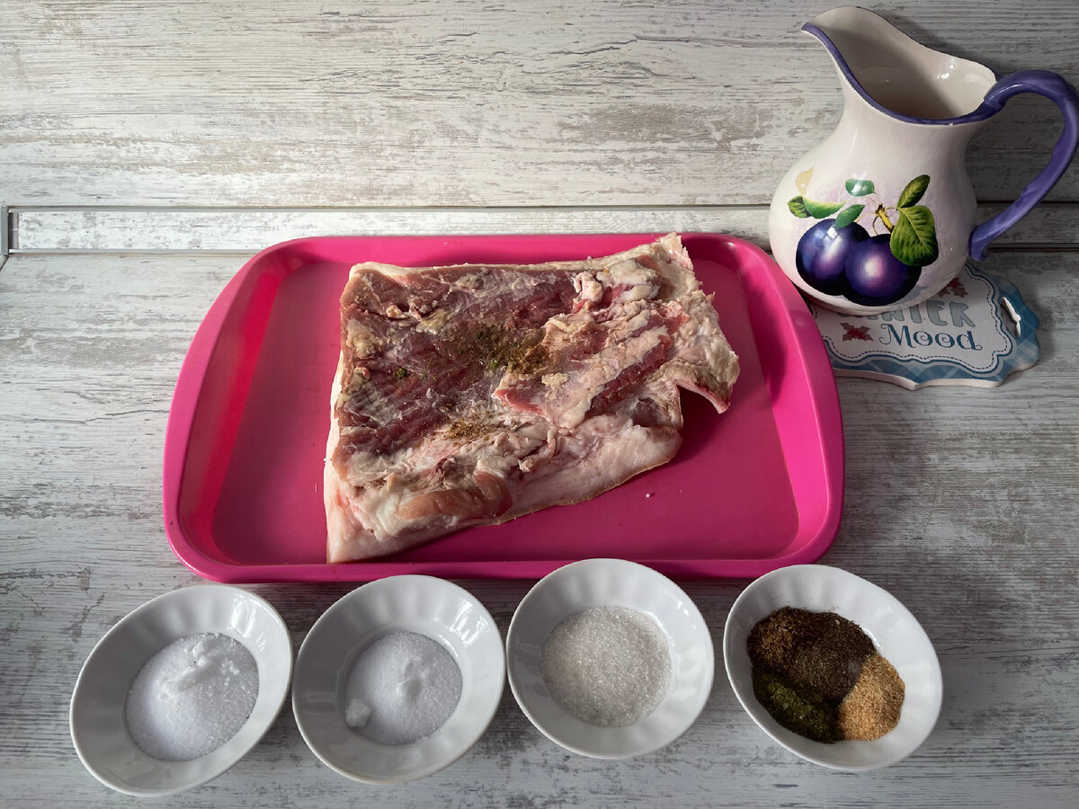 Этим рецептом приготовления сала со мной не делился шеф-повар из дорогого русского ресторана, под пытками у старой бабушки соседки не выпросила. Все банально просто. Увидела рецепт в интернете. Посмотрела видео, записала рецепт, приготовила. Канал у меня не кулинарный, статьи с рецептами имеют самый низкий процент просмотра, поэтому делюсь рецептами, которые понравились самой, чтобы не потерять, храню их здесь. Все рецепты собраны на канале в одноименной рубрике. В конце статьи оставлю ссылку. Для данного рецепта, исходя из названия, сало необходимо взять с прослойкой мяса. Ингредиенты: (приведены на 1 кг сала) Ингредиенты: Если нет нитритной соли, заменить обыкновенной поваренной. Чеснок заменяла сухим из магазинного пакета, мне так больше нравится. Тмин был только в семенах, перемолола в кофемолке вместе с лавровым листом в порошок. Все специи перемешала. Хорошо натерла кусок сала со всех сторон. Положила в целлофановый пакет и в холодильник на четыре дня. Каждый день переворачива