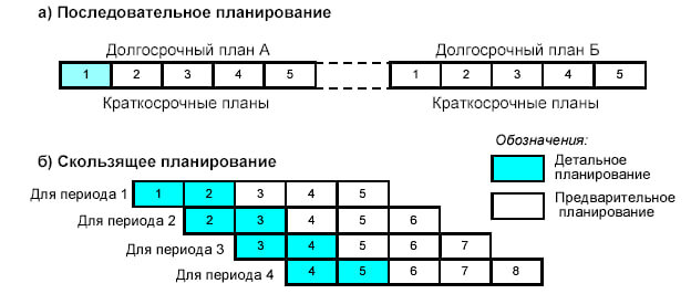 При последовательном календарном, привычном большинству планировании, создается план на год. По прошествии года осуществляют сверку плана и факта. При больших отклонениях в течение года производится корректировка Плана. При скользящем (оно же ролинговое) планировании первоначальный момент (самый первый раз планирования) также составляется план на год, но с разницей для разных
