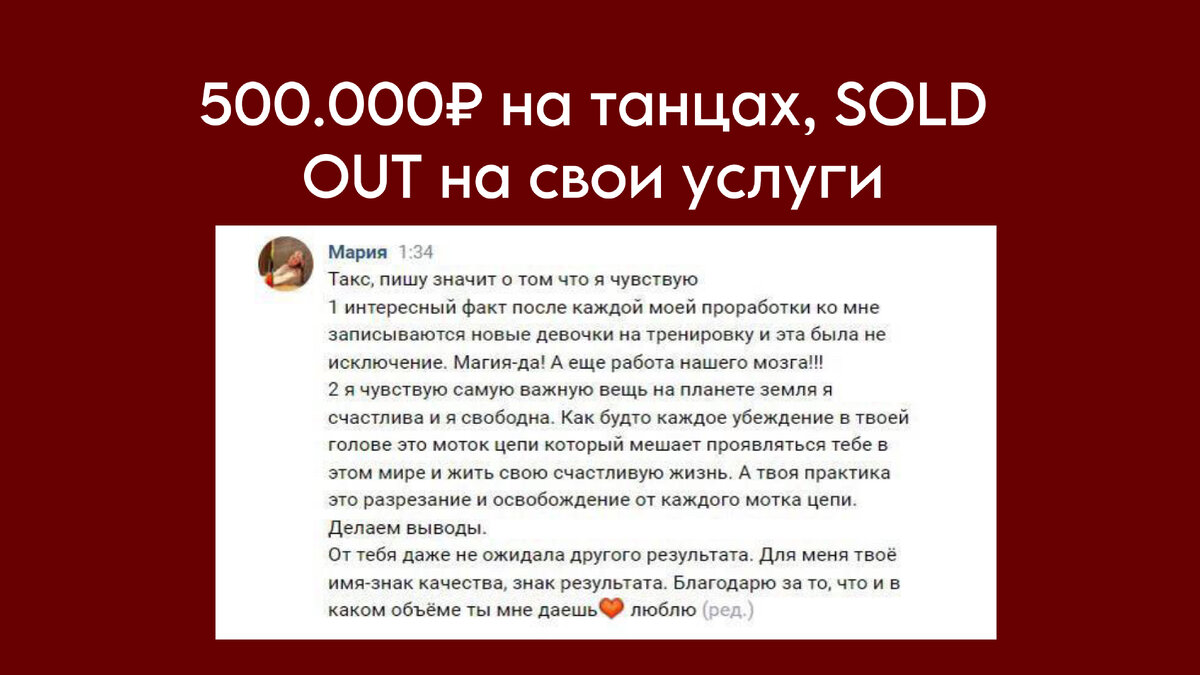 Маша — одна из первых, кто пришел ко мне в работу, когда я только начинала вести сессии по своей методике. Она — преподаватель женственных танцев в нашем городе (Ярославль), но долгое время была в маркетинге со своим агенством. С каким запросом Мария пришла ко мне? После одной сессии, на которой мы выявили важную негативную установку, а именно: Танцы — это несерьезный бизнес Именно данная установка мешала Маше поставить желаемый чек на свои абонементы, собирать полные группы и ощущать себя уверенной в преподавании Данная установка пришла из рода, потому что все родственники занимались каким-то серьезным делом, а мама постоянно говорила, что на этом не заработать. Мы выгрузили данное убеждение, поработали с другими установка и Маша просто расцвела! Сейчас она продолжает постоянно работать над своими установками. Что мы получили: Я знаю, что каждый эксперт и специалист хочет получить полную запись на свои услуги, но для этого важно не только делать правильные маркетинговые шаги (привлек