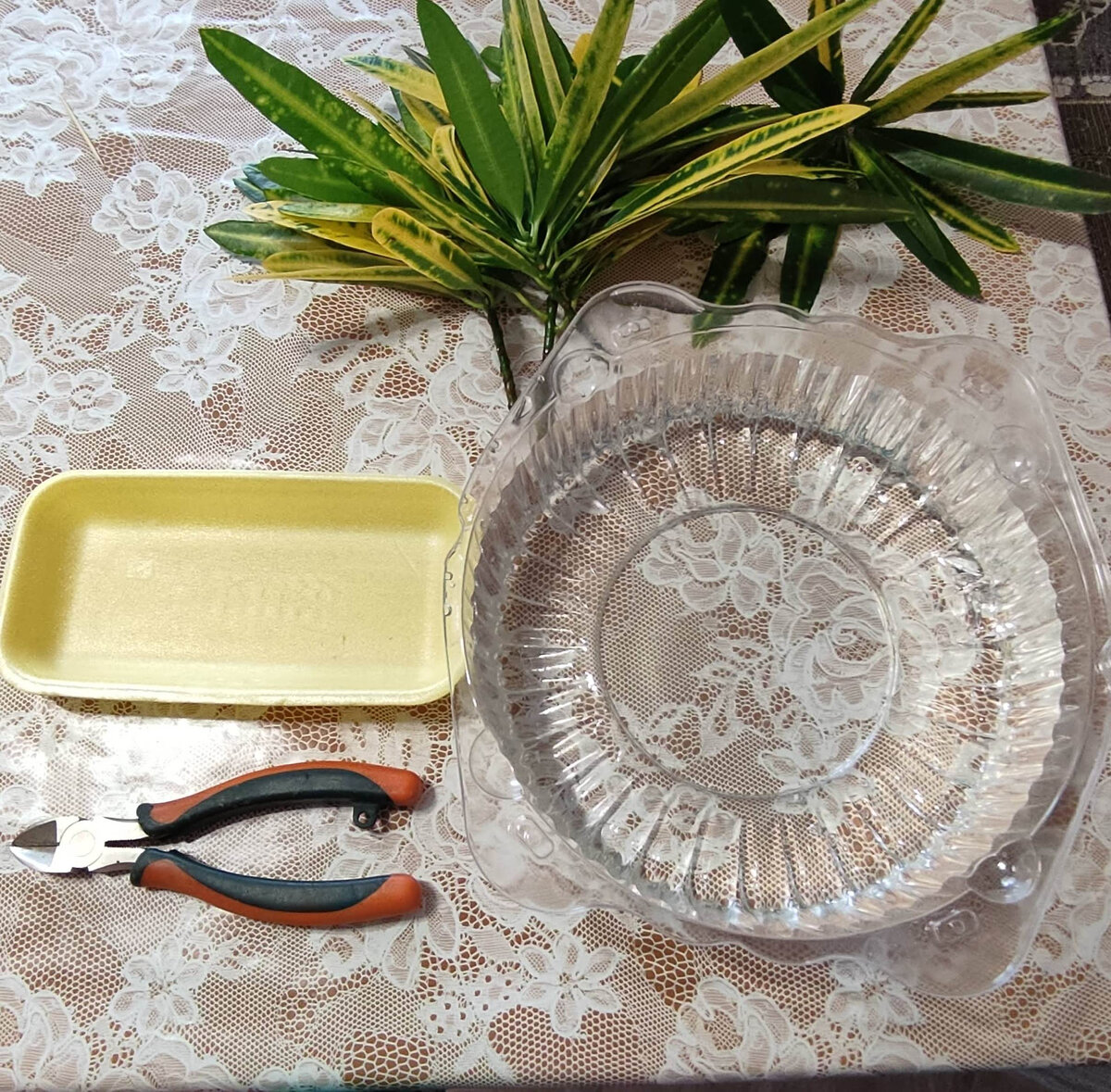 Кротон мне надоел. Очень уж капризный мне попался, только немного пересох-сбрасывает листву. Стоит, голыми бадылями сверкает. Живет он у меня уже давно, один раз я его укореняла, сбросил листву и все, остались листья только на макушке, метелки такие. Подробнее про этот цветок можно прочитать в статье ниже, вдруг с ним кто не знаком? И фото моего кротона там же. Зимой листьев стало еще меньше. Обрезала я ему макушки, поставила в воду укоренять, 4 макушки у него было. Кот Василий то стакан с водой, где укореняется кротон, опрокинет, то эти бадыли добудет из стакана, короче, нужен план! Придумала я вот что: Взяла такой желтый лоточек, коробку из-под торта. Гвоздя не нашла обыкновенного, вместо него взяла кучерявый гвоздь, пассатижи на глаза тоже не попали, но попали кусачки, не принципиально. Нагрела саморез на плите, держала кусачками, проплавила дырки в лоточке. Лоточек поместила в крышку от торта, наполненную водой. В отверстия воткнула ветки кротона. И отпустила в свободное плавание.