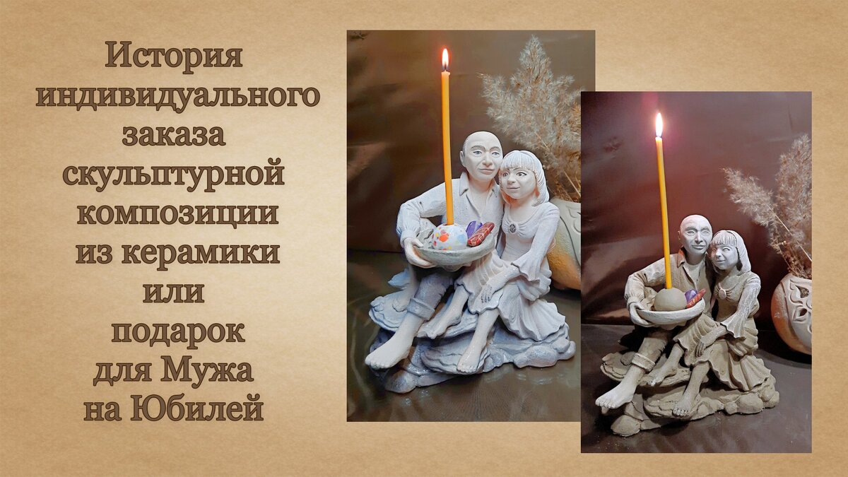 Этот индивидуальный заказ поступил ко мне год назад. Я очень люблю делать не стандартные персонифицированные заказы. Это как проверка для моего умения и мастерства. Слепить человека по фотографии это кропотливый труд, но очень интересный и захватывающий. Началось с того, что женщина спросила меня могу ли я взяться за изготовление подарка для ее Мужа на Юбилей. Ей хотелось, что бы подарок был необычный и произвел на Мужа впечатление. Мы с ней провели как это сейчас говорят креативщики "мозговой штурм" и я предложила ей идею Семейного оберега в виде скульптурной композиции из ее скульптуры и скульптуры Мужа. Так как я набросков не делаю (леплю на потоке своего канала). То мной была подобрана примерная фотография из интернета и предложена заказчице для наглядности моей идеи. Лепила я скульптуру дня четыре, прорабатывая все детали. Получилась композиция деталью которой стал подсвечник. Мной так же были подобраны по расчету психоматрицы, по датам Рождения Мужа и Жены натуральные камн