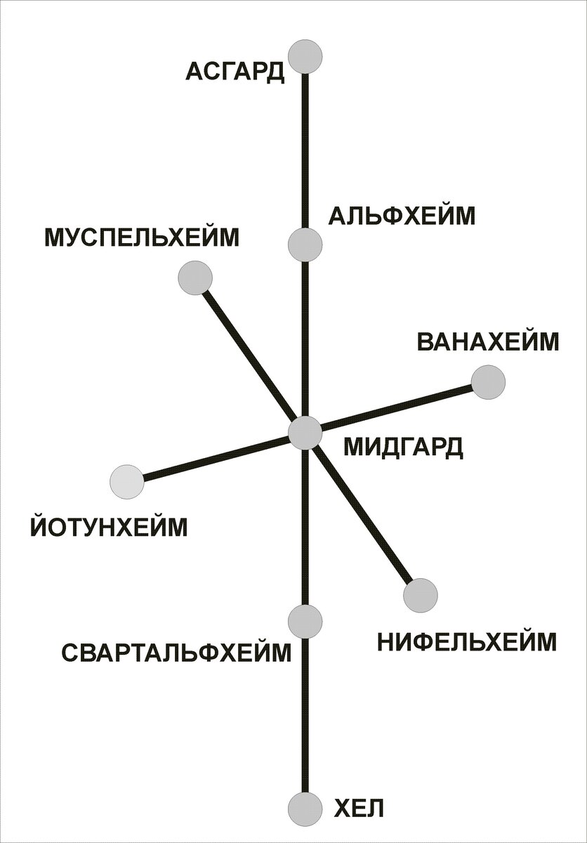 Согласно вышеуказанной цитате Асгард (Воля Богов) и Хел (Воля Норн) контролируют (не полагаясь только на свои матрицы – Альфхейм и Свартальфхейм) Йотунхейм, Муспельхейм, Ванахейм и Нифельхейм (а также вмешиваются при необходимости). Ну, а театр лицедейства (Мидгард) находится под прямым и непосредственным управлением матриц, Асгард и Хел сюда не вмешиваются. При этом Йотунхейм, Муспельхейм, Ванахейм и Нифельхейм проявляются (спрягаются) в Мидгарде (центр приложения всех сил), но проявляются исключительно через театр Мидгарда (отчего на сцене этого театра мы всё видим в искаженном виде. Связи (взаимосвязи) всех девяти миров дерева проявляются как мосты, и каждый мост управляется Руной Старшего Футрака. Данная картина, ранее представленная мной миру в моих книгах и на портале Руны Одина показана на рисунке: