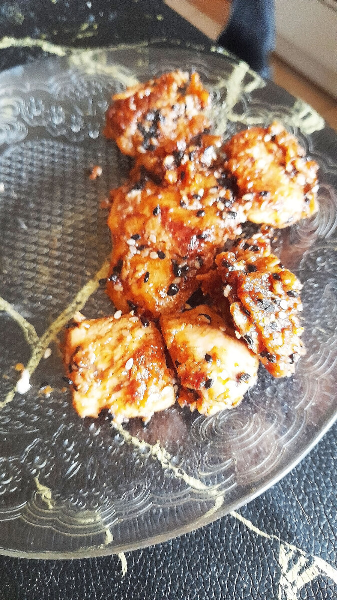 Всем привет! Редко, конечно,я появляюсь, но, как говорится, лучше меньше, да лучше! Не буду долго размусоливать, давайте готовить. Сразу оговорюсь, что в граммах сегодня рецепта не будет, т.к. все делала на глаз, но получилась гастрономическая бомба. Расскажу примерный объем продуктов. ИТАК: Куриное филе (у меня грудка) - 500 грамм; Молоко (любой жирности) - 1 стакан; Устричный соус - 1-1,5 столовые ложки (можно и без него); Кетчуп томатный - 2-3 столовые ложки; Соевый соус - около 4х столовых ложек; В оригинальном рецепте так же присутствует соус чили, но у меня его не было, я добавила аджику - 0,5 чайной ложки; Сахар - 2-3 чайной ложки; Молотый имбирь - 1-1,5 чайной ложки; Соль, молотый черный перец (по вкусу) Вода - 0,5 стакана; Мука - 2-3 столовые ложки; Кунжут - по желанию НАЧИНАЕМ ХЛОПОТАТЬ: похлопотать, конечно, придется, приготовление немного заморочное, но кому сейчас легко. Куриное филе нарезаем квадратиками, примерно, 2 см. на 2см, кладем в глубокую миску, солим, перчим по