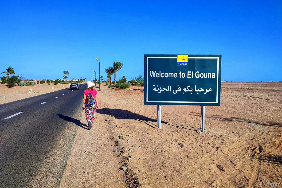 Эль-Гуна является особенным местом на побережье Красного моря. Городок расположен в 30 километрах от Хургады и отличается кардинально. Чистый, тихий и ухоженный, оазис красоты и роскоши. Это закрытый охраняемый курорт исключительно для проживающих в отелях и на виллах. Большинство египтян никогда не были в Эль-Гуне. Иностранцы могут приехать погулять, предъявив паспорт на КПП. Для работников сферы обслуживания организован общественный транспорт, туристы в основном пользуются такси. Мало кто входил в Эль-Гуну пешком. Теперь у меня есть такой уникальный опыт :) В пустыне рядом с Эль-Гуной есть масштабный арт-объект, который виден из космоса. Приехали, посмотрели, полазили там, пофотографировали. Надо как-то выбираться в цивилизацию. Догулять до Эль-Гуны казалось отличной идеей, ведь до ближайшего въезда меньше километра. Однако, это оказался технический въезд. Всего их три: 1 - для рейсовых автобусов, которыми приезжает на работу обслуживающий персонал, 2 - красивый въезд с пальмами и во