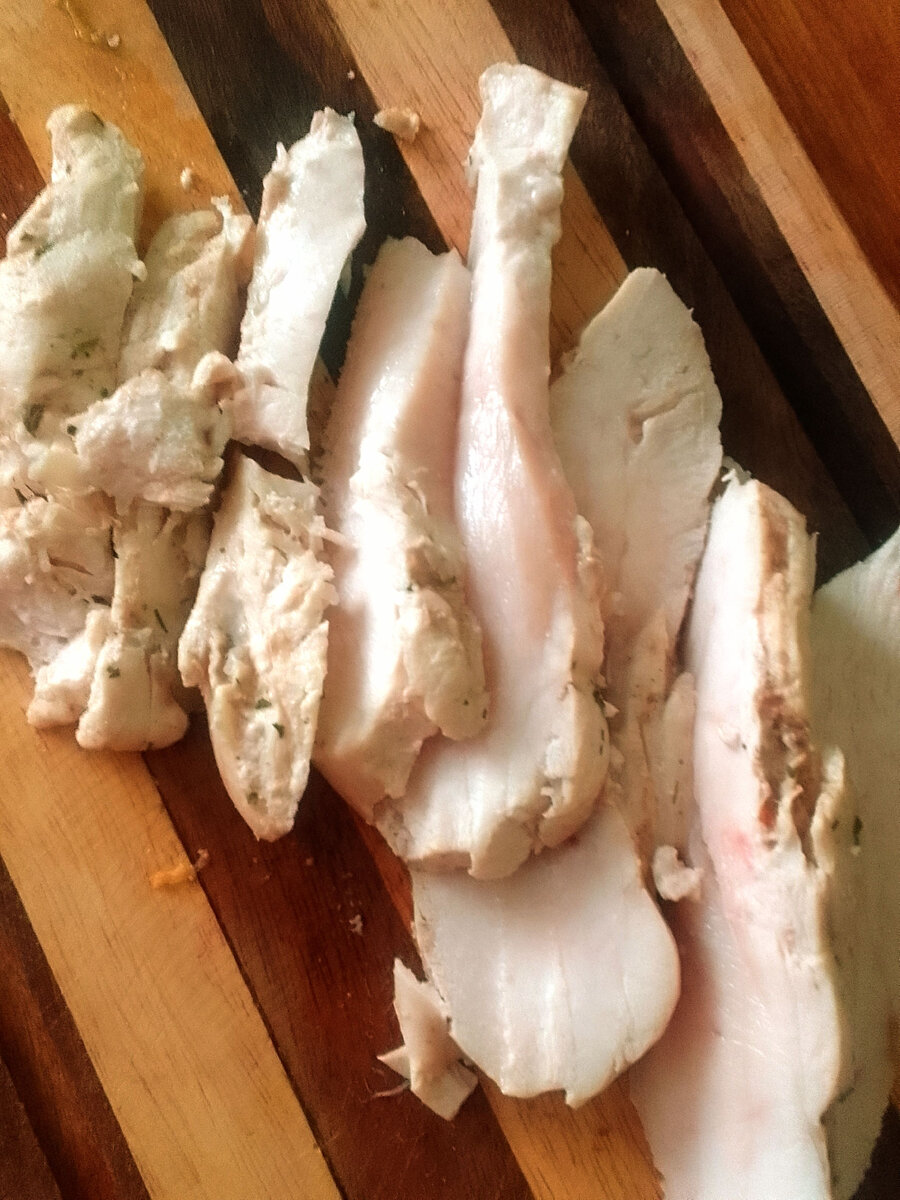 Нужна куриная грудка, отварить немного, а почему не до готовности, а чтобы не очень сухая была потом в пицце.