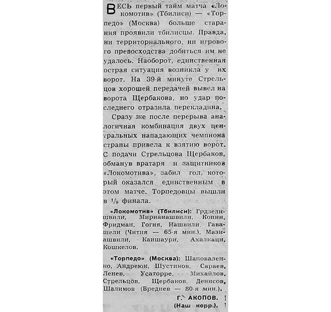Весь первый тайм матча «Локомотив» (Тбилиси) – «Торпедо» (Москва) больше старания проявляли тбилисцы. Правда, ни территориального, ни игрового превосходства добиться им не удалось. Наоборот, единственная острая ситуация возникла у их ворот. На 39-й минуте. Стрельцов хорошей передачей вывел на ворота Щербакова, но удар последнего отразила перекладина.