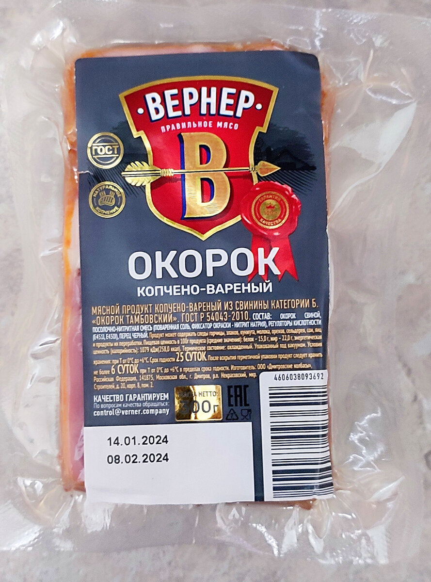 Друзья, всем привет! Заскакивал на днях в Чижик и увидел несколько мясных новинок. Конечно же решил попробовать. До этого я пробовал почти всю продукцию Вернер. Что то было хорошее, что то не очень. Говорю сразу, это не реклама, а обычный отзыв или обзор продуктов. Окорок копчено-вареный "Тамбовский" категории Б. Цена 199 рублей. Состав: окорок свиной, посолочно-нитритная смесь (поваренная соль, фиксатор окраски- нитрит натрия), регуляторы кислотности (Е451l, Е450l), перец чёрный. Сделано по ГОСТ Р54043-2010. Изготовитель: ООО "Дмитровский колбасы", г. Дмитров. Срок годности 25 суток. Вот так выглядит мясо. Есть вкрапления жира. Мясо суховатое. Соли и специй добавлено в меру. По вкусу очень похоже на грудинку, которую я обозревал до этого. Изготовитель то же оказался, в чем я не удивлён. Реально как будто одно и тоже мясо. В принципе обычное мясо. Но стоит как мне кажется дороговато. В других магазинах по акции можно найти такой окорок намного дешевле. Буженина "По-домашнем