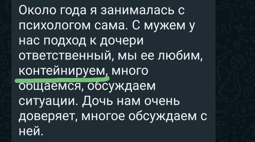 В последние месяцы стала часто замечать в диалогах с родителями появление термина "контейнирование". Приятно, что многие родители разбираются в теме🤓 Но я всё же хочу рассказать об этом подробнее и прояснить некоторые моменты. Термин «контейнирование» впервые упоминается в психоаналитической литературе, авторство - Уилфреда Биона. Он активно изучал детскую психику и сделал вывод, что маленькому ребенку очень трудно (можно сказать даже невозможно) дифференцировать свои эмоции и справляться со сложными переживаниями самостоятельно. Поэтому ему нужен человек (своего рода "контейнер"), который поможет пережить эти непонятные и новые для него состояния. Конечно, чаще всего в роли этого "контейнера" выступают мать и отец. Процесс контейнирования можно описать следующим образом: Шаг 1. Понять, какую эмоцию ребенок испытывает - наблюдаем, анализируем контекст ситуации и поведение ребенка. Шаг 2. Принятие состояния ребенка - подходим и подключаем тактильный контакт (гладим, обнимаем, берем за