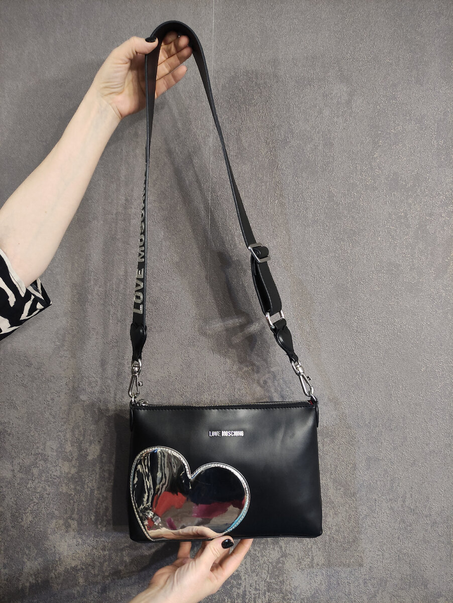 Всем привет! Меня зовут Ирина, добро пожаловать на мой канал! Сегодня продолжаем рассматривать мою коллекцию сумок из секонд-хенда. Расскажу об оригинальной акцентной сумочке кросс-боди от "Moschino". Стильная сумочка простого, можно сказать, минималистичного фасона с акцентными деталями – большим зеркальным металлизированным сердцем (символом бренда). "LOVE MOSCHINO" – бренд необычный, отличающийся от привычных марок премиум-класса. Он как будто бы не всерьез относится к моде, предпочитая вести свою игру. Сказочные коллекции, провокационный дизайн, одежда, похожая на предметы искусства, – вот что такое мода "LOVE MOSCHINO". Фирменное позиционирование бренда особенно заметно на аксессуарах – сумках, кошельках, и на обуви, которые цепляют взгляд эксцентричным дизайном, смелостью оттенков и необычной формой. Элементами дизайна служат и игривые узоры, и узнаваемый логотип бренда, а также неизменное сердце "Moschino". Вот и мне досталось та