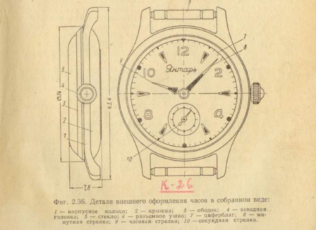 Корпус часов служит для предохранения механизма от загрязнения и повреждения, для соединения с браслетом или ремнем, а также декоративной деталью внешнего оформления часов. Корпусы одних и тех же конструкций часовых механизмов могут иметь различную форму и отделку. Корпус часов К-23 (фиг.2.36) состоит из корпусного кольца, ободка, стекла крышки и втулки под заводную головку. Корпусное кольцо и ободок изготовляются из нейзильбера, латуни, серебра или золота. Нейзильберные и латунные кольца и ободки хромируют; иногда их золотят. К корпусному кольцу крепятся часовой механизм, ободок со стек- лом, крышка и ушки для ремней. Ободок является деталью для крепления стекла к корпусному кольцу. В некоторых конструкциях корпусное кольцо и ободок составляют одно целое. Стекло для часов изготовляется из плексигласа. Под стеклом находятся циферблат и стрелки часов. Стекло предохраняет стрелки и циферблат от повреждений, а весь механизм часов — от попадания в него пыли и влаги. Крышка корпуса изготов
