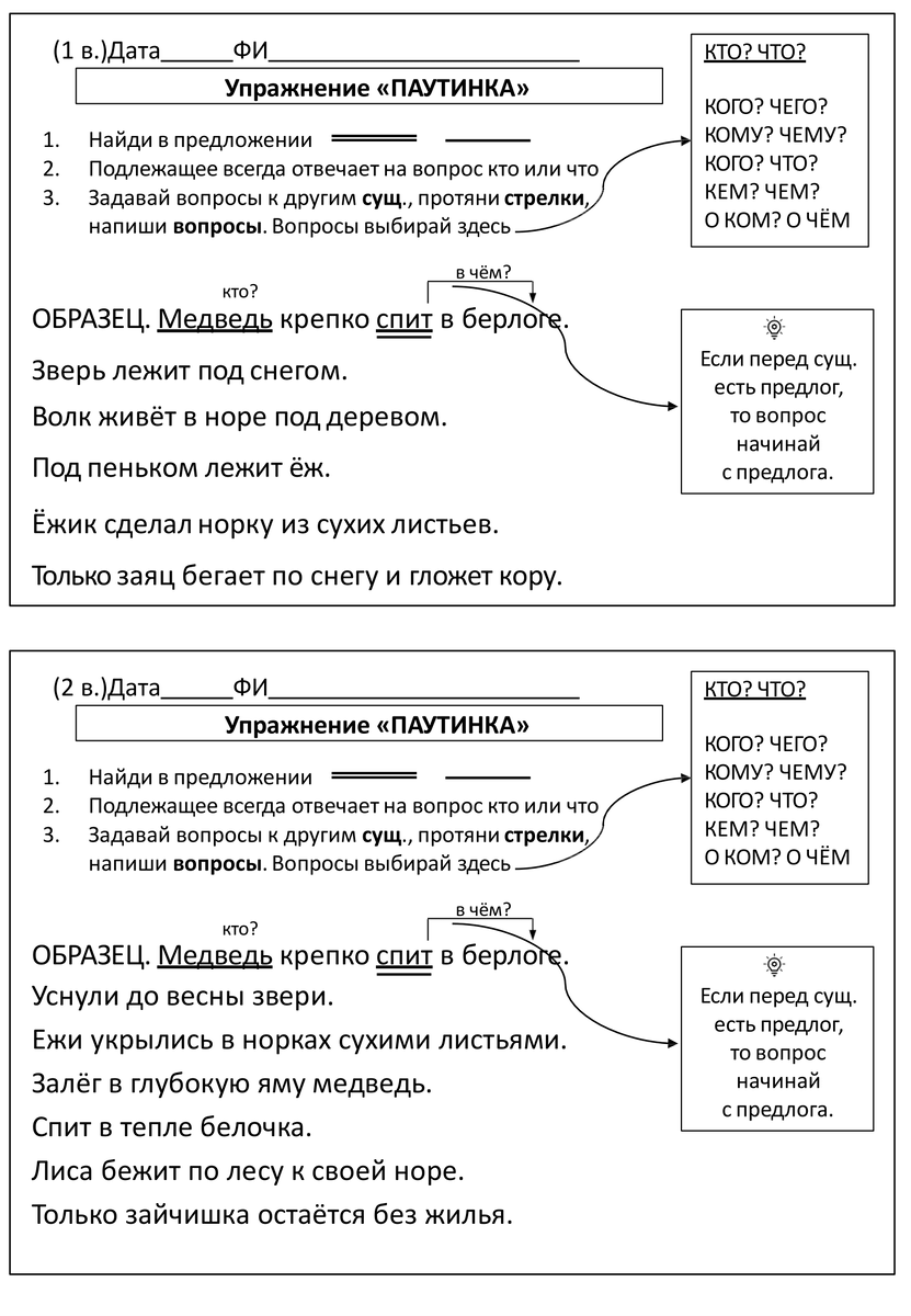 1) Учимся задавать падежные вопросы, самый длительный этап, мнооооого карточек, слово падеж не вводила до тех пор пока, дети не научились безошибочно задавать падежные вопросы в словосочетаниях и предложениях. Это упражнение у нас называлось "Паутинка": растяни стрелки и задай вопросы. Стрелки так похожи на паутинку
