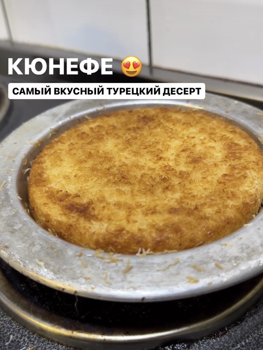 Ну как вам такой поворот? Все привыкли, что пахлава и Турция — это синонимы, потому что она там в каждом магазине и прилавке, на каждом углу. От неё уже плохо становится, ведь не все любят такое сильно сладкое. Поэтому я знакомлю вас с новым блюдом. Итак, внимание— вкуснятина Кюнефе🥳 Обязательно попробуйте , если ещё не пробовали. Но, наверное, все уже и так знают, что это самый нежный десерт, который можно есть каждый день и он не надоест. А самое главное — он не такой сладкущий, как пахлава. Это мое любимое кюнефе. Ингредиенты Эта традиционная сладость делается из теста (которое очень напоминает мелкую лапшичку), которая в Турции называется кадаиф (ещё иногда можно увидеть название катаифи), и козьего сыра. Его подают с шариком мороженого. И поливают сладким сиропом. Но я всегда прошу, чтобы добавляли его чуть-чуть и получается очень нежно, не приторно 😍А особенно классно, когда сам готовишь и можешь отрегулировать сладость. Поэтому я отправляюсь на кухню к мужу — лучшему повар