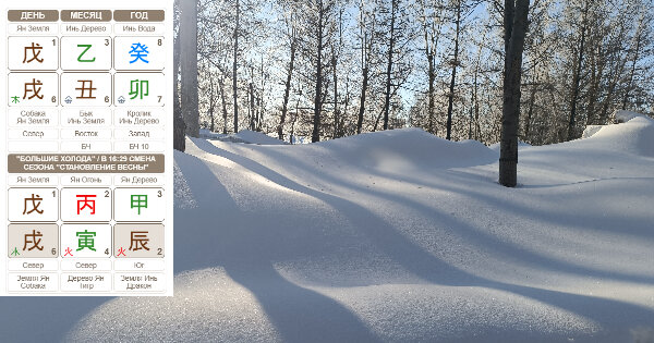 День смены сезонов. Большие Холода переходят в Становление Весны. Поэтому этот день поделится на две части. До часа Обезьяны🙈 по Пекину будет еще месяц Деревянного Быка, а дальше уже пойдет месяц Огненного Тигра.