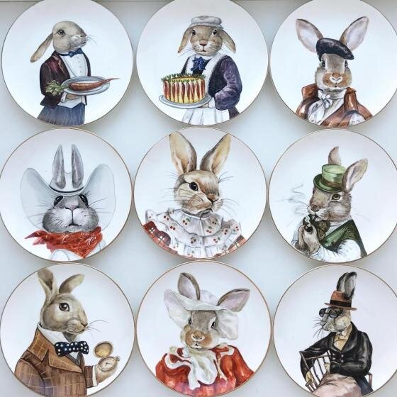Зайцы (кролики) в человеческих образах, прекрасных дам и джентльменов. Посвящается грядущим праздникам. Мужскому и женскому дню. А еще весне. Во многих странах заяц (или кролик) – это традиционный элемент пасхального декора, символ весны и плодородия. Настоящие мужчины Тарелки диаметров 25 см с обводкой золотосодержащим препаратом. Можно использовать в качестве декоративных (на стену, на полку) или сервировочных, для подачи на стол. К декоративной тарелке прилагается подвес. Надглазурная роспись по фарфору, многократные обжиги в муфельной печи. Рисунок не стирается, можно мыть в посудомоечной машине, использовать для приема пищи, сервировки стола или в качестве декоративной настенной тарелки (с тыльной стороны может быть установлен подвес для крепления на стене). Зайчихи-модели Приём известный, но очень эффектный - соединять голову животного и фигуру человека. Решила воспользоваться. Выбрала из модных журналов 1950-х годов эскизы моделей и пририсовала к ним мордашки зайчих. З