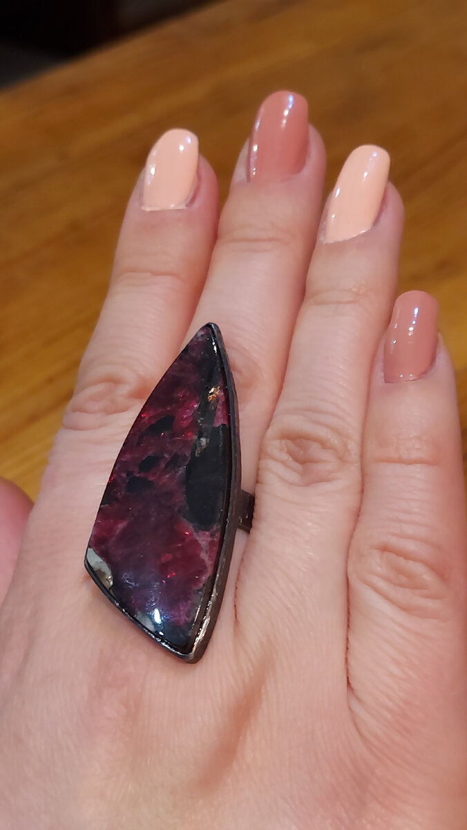 Наш новый серебряный перстень "Ночные маки" с эвдиалитом выполнен полностью вручную по заказу клиента. Точнее, теперь уже не наш 😁 Эвдиалит - роскошный камень, один из моих любимых! Эти слегка прозрачные насыщенно-красные кристаллы в чёрном эгерине смотрятся ярко и одновременно, строго и торжественно. Камушки такого качества находят только в Хибинских горах на побережье Белого моря. Минерал известен также под названиями альмандиновый шпат, лопарская или саамская кровь. Последнее название связано с легендой о нападении на племена саамов (лопаров), живших в Хибинах охотой и рыболовством, хорошо вооруженных грозных шведов - профессиональных воинов. Поражение казалось не минуемым. А пленение и рабство - не выносимыми. В борьбе за свою свободу эти племена решили идти до конца, не считаясь с любой ценой и потерями. И только поэтому им удалось победить жестоких захватчиков. Много саамской крови пролилось в тех битвах. По легенде, кровь мужественных саамов, щедро оросившая землю, п