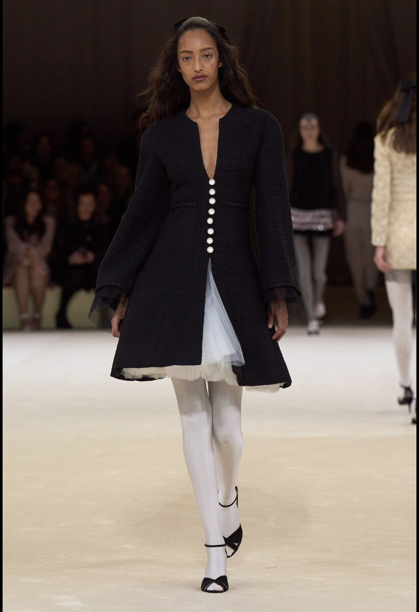 Кутюрный показ Chanel. Легкость, привлекательность и девчачья фривольность в постельных оттенках. Всё для любителей настоящей романтики. Основные детали: ▫️белые колготки + черные босоножки (мотивационный тренд, чтобы скинуть пару килограмм к лету😊) ▫️собранные волосы в черный атласный бант ▫️цветочный топ/бра поверх тонкого белого лонгслива. ▫️многослойность из полупрозных тканей.