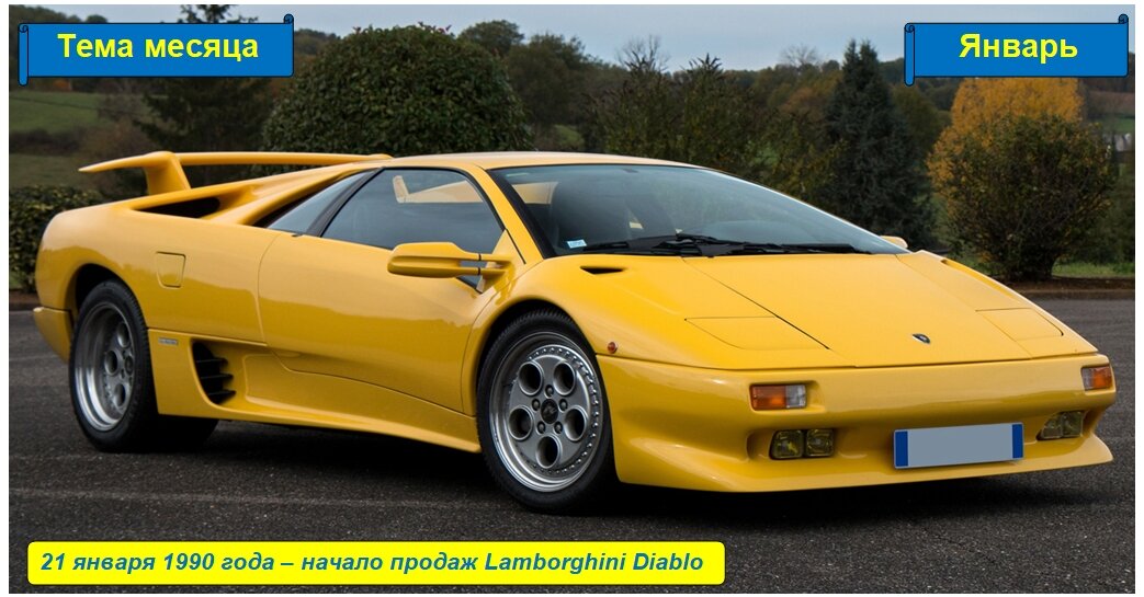 В честь годовщины начала выпуска автомобиля Lamborghini Diablo, рубрика «Тема месяца» в январе будет посвящена этому автомобилю, а каждый день будет выходить пост про одну версию этого легендарного суперкара.