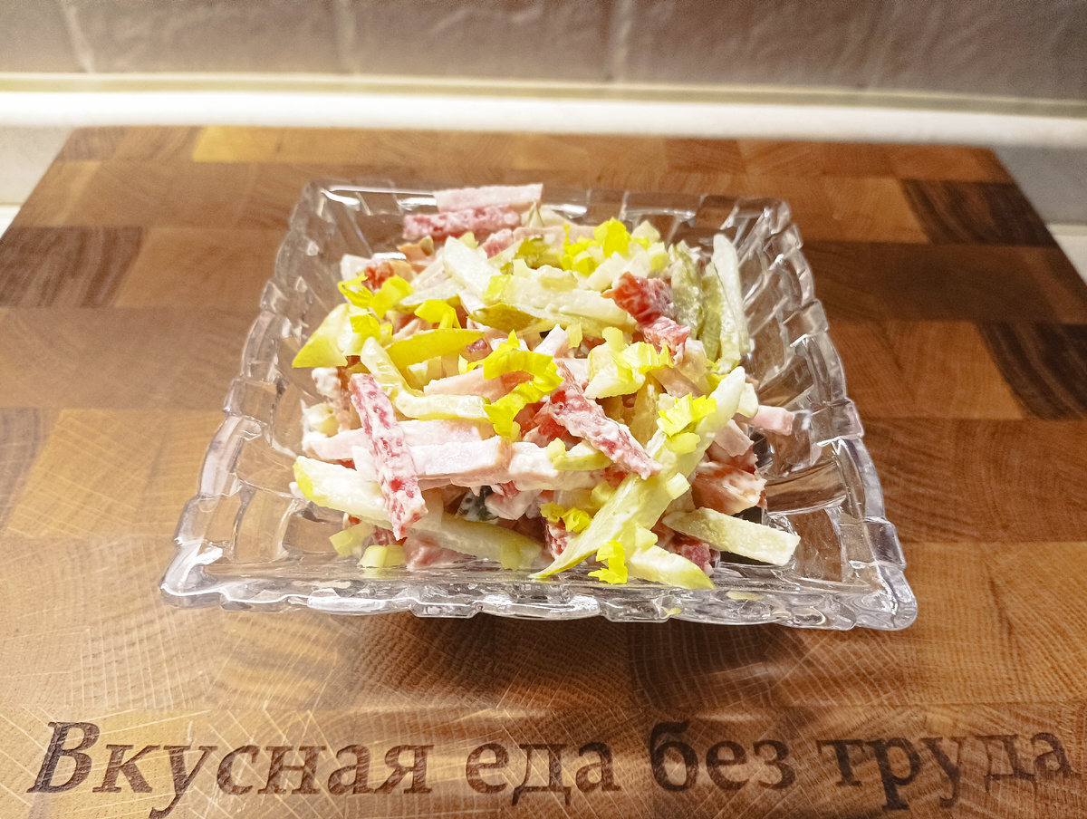 Не нашла на просторах Интернета похожего рецепта. Очень люблю этот салат готовить для девичьих посиделок. Он пользуется неизменным успехом. А в последние годы вдруг мужчины из семьи распробовали его. Раньше я его готовила в посленовогодние дни, когда оставалась всякая мясная нарезка. Сейчас у нас нарезка не в ходу, поэтому готовлю специально на Крещение и Пасху. Вот так повелось. Ингредиенты: 200 гр. ветчины 70-100 гр. колбасы типа салями 2 груши 2 маринованных огурца 3 ст. л. майонеза зелень по вкусу Ветчину и салями нарезаю тонкой соломкой. Стараюсь, чтобы кусочки по размеру соотносились друг с другом. Маринованные огурцы выбираю не очень кислые. Можно взять солёные огурцы. Груши должны быть твёрдыми, не очень сладкими, а сочными и чуть недозрелыми. Груши можно очистить, если кожура грубая. Нарезаю груши и огурцы соломкой, похожей на мясную. Всё смешиваю, заправляю майонезом и украшаю зеленью. 5 минут — и салат готов! Салат — чемпион по времени приготовления. На мой субъективный в