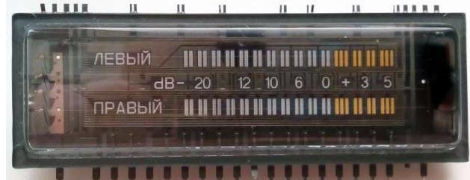 07.12.2023 Автор: liman28 Индикатор ИЛТ4-30М (П402А) двухцветный — основной цвет зелёный, цвет элементов, отображающих наивысшие уровни сигнала — красный. Выполнен в стеклянном корпусе с 20-ю плоскими лужеными выводами для монтажа на печатную плату. Основные параметры индикатора ИЛТ4-30М Как правило в ИЛТ4-30М две сетки одна для верхней части индикатора, вторая для нижней, но в моем индикаторе три сетки, первая сетка находится на элементами «ЛЕВЫЙ» «ПРАВЫЙ» и две другие над верней и нижней частями шкал уровня сигнала. Поэтому первая сетка не имеет управления и напряжение +30 В подается на нее через резистор. Вторая и третья сетка запитываются от транзисторных ключей. Так же следует учитывать, что что элементы «ЛЕВЫЙ», «ПРАВЫЙ», шкала dB и первый сегмент индикатора уровня имеют один общий анод (поэтому горят постоянно и не участвуют в динамической индикации), который так же не имеет управления и напряжение +30 В подается на нее через резистор. Все остальные сегменты индикатора имеют упр