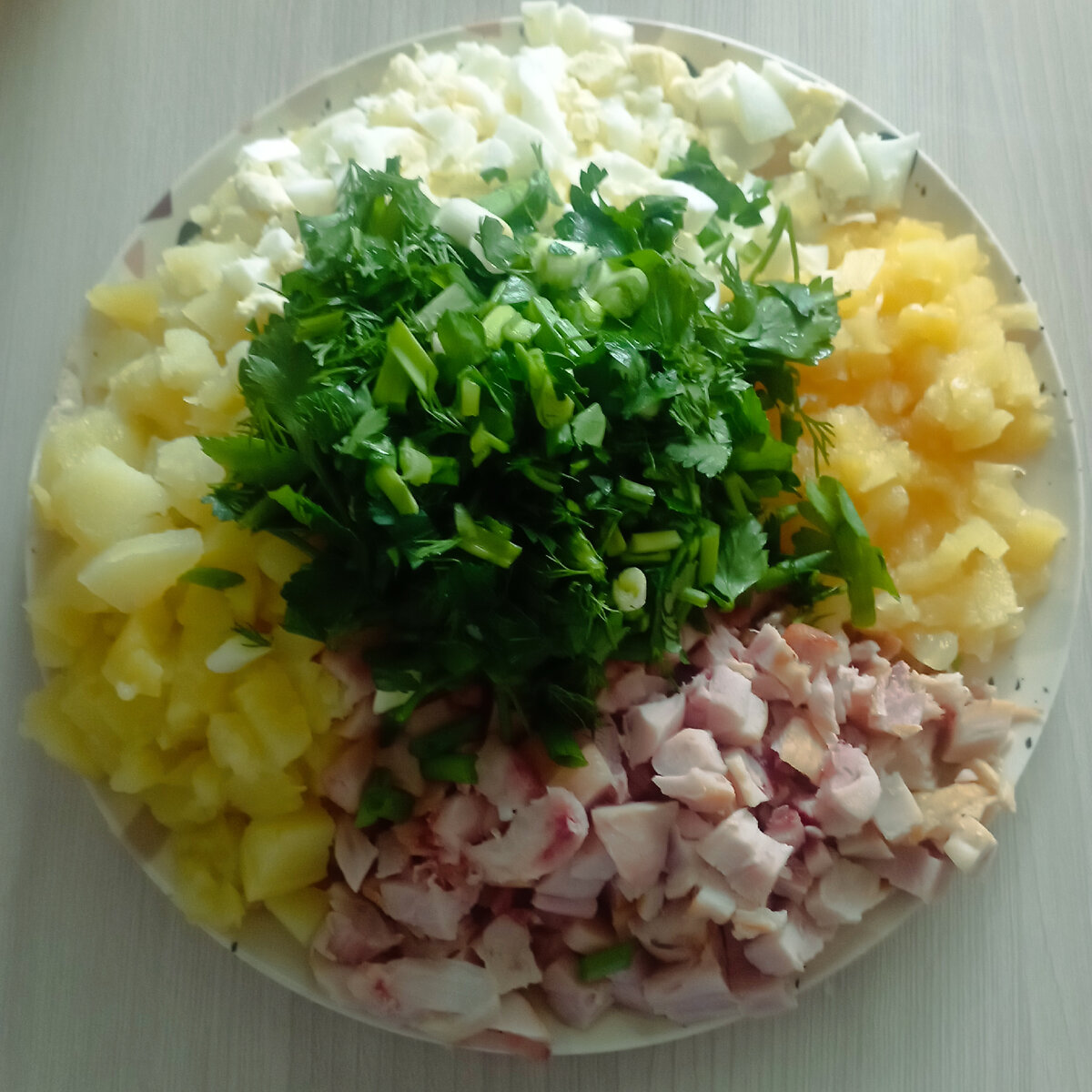 Для приготовления понадобиться: голень копчёная(куриная)-300гр(без кости), картофель-5шт, яйцо-5-6штук, ананас-(у меня было 3-колечка) лук зелёный, зелень (укроп, петрушка), майонез,соль по вкусу. Картофель, яйца отварила, голень от кости отделила, нарезала кубиками, так же и ананас, покрышила зелень. Всё это перемешала в отдельной ёмкости, посалила и готово! Приятно аппетита!