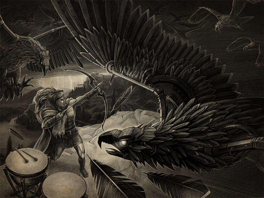 В окрестностях аркадского Стимфала, Где всегда было много добрых лиц. Гулять у вас желание бы отпало Из-за угрозы жизни в виде птиц. Животных всех почти там перебили. А позже стали пировать людями. Из твёрдой бронзы у них перья были. А медными острейшими когтями Они свою добычу разрывали. Взлетев под небеса свои же оперенья Подобно стрелам их в врагов пускали. И не было от этих птиц спасенья… *** Не тратя время на пустые промедленья, Вооружившись, тронулся он в путь. Хоть и тяжёлое то было порученье, Оно Геракла не могло спугнуть. Силён и ловок, словно барс, мужчина, Но всё равно для воплощенья плана Ему на помощь прибыла Афина, Вручив герою два больших тимпана. Из меди были оба барабана. Могучий бог Гефест их давеча сковал. Их звук подобен грому, без обмана, Я так бы этот грохот описал. Афина на высокий холм велела встать. У леса, где у чудищ гнёзда вились, Чтоб можно было их перестрелять, Когда они от страха в небо б взвились…