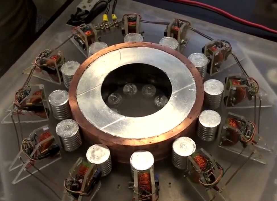Выяснилось, что если количество цилиндрических магнитов, расположенных вокруг, равно некоторому минимальному числу, то они начинают вращаться самостоятельно, увеличивая скорость до тех пор, пока не придут в динамическое равновесие.