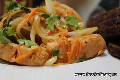 Традиция готовить "сырую" маринованную рыбу есть у очень многих народов. У наших северных - это сугудай или строганина, наиболее известная и "гламурная" - это севиче и не менее популярная корейская вариация на эту тему - это, как раз, хе. Готовить хе можно и из мяса, также подходят не только красные, но и белые сорта рыбы. Набор продуктов для маринада гораздо более демократичен, чем для севиче. И соевый соус и все остальное, что нам тут понадобится это продукты которые есть в доме всегда. Так что купили свежую рыбку и для приготовления рыбного хе можно приступать не раздумывая "есть ли жизнь на Марсе". В нашем случае есть... и не на Марсе, а у нас... дома. Так что великолепная закуска к праздничному столу или с картошечкой на ужин у нас в кармане! Вперед! Для рецепта потребуется: 800г красной рыбы 3 луковицы 1 морковка пучок кинзы 3 зубчика чеснока половинку красного острого перца Из приправ и специй понадобится: 2 столовые ложки 70% уксусной эссенции 2 столовые ложки соевого соуса