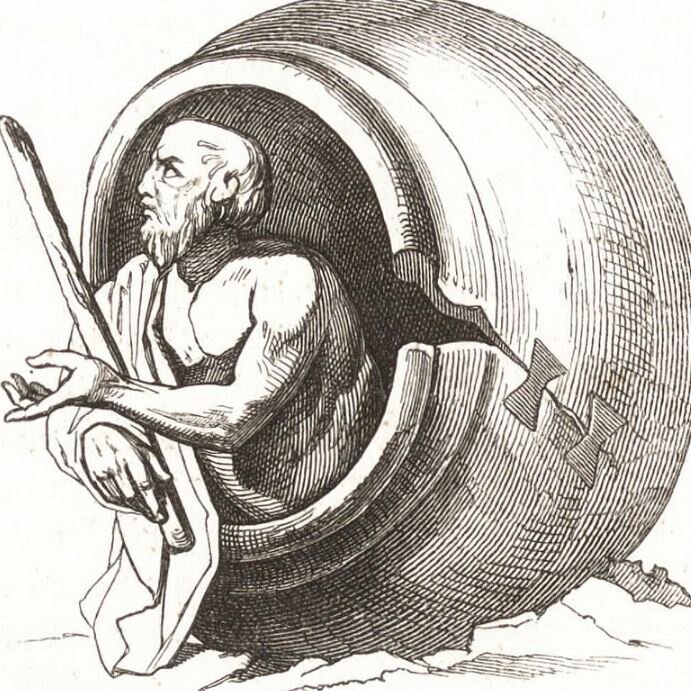 В молодости Диоген получил пророчество от дельфийской пифии «переоценивать ценности», которое вначале принял буквально и стал фальшивомонетчиком. После того, как его уличили в преступлении, был вынужден бежать из родного города. Диоген прибыл в Афины и стал учеником основателя школы киников Антисфена. Вскоре стал знаменитым благодаря своей мудрости, стилю жизни и эпатажным выходкам.