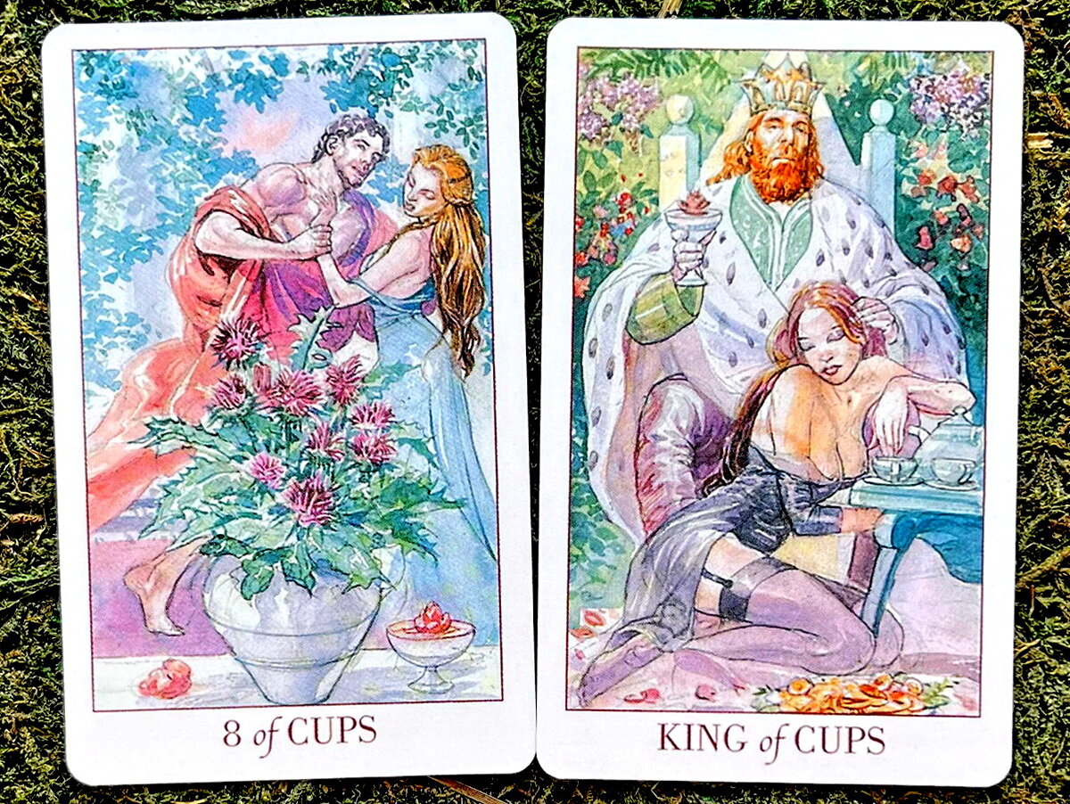 Давайте для полной картины посмотрим, как другие колоды изображают ту же ситуацию, те же самые энергии - 8 кубков и король кубков: