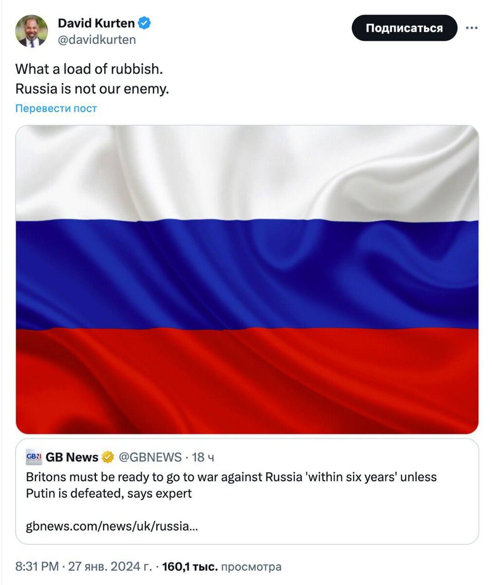 "Что за бредятина. Россия нам не враг", — написал в Х лидер британской партии "Наследие" Дэвид Кёртен в ответ на сообщение GB News о том, что британцы должны готовиться к войне с Россией в ближайшие шесть лет.