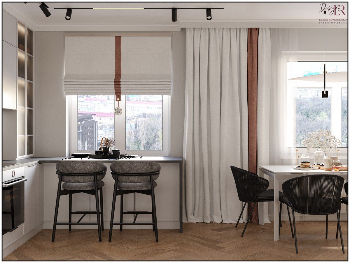 Угловая комната кухни-гостиной имеет обеденную зону и даже небольшую барную стойку у окна для двух человек, как продолжение кухонного гарнитура в подоконник, напротив окна с римской шторой. Минималистичный стиль встроенного кухонного гарнитура в бело-сером цвете с отделкой фартука в темном керамограните, который добавляет глубины этому пространству. Ярким элементом выступает встроенная стойка современного буфета с подсветкой. Светлая кухня в минималистичном дизайне, с закрытыми полками от пола до потолка. За углом комнаты разместилась гостиная зона с диваном, телевизором и тумбой современной классики. Основное освещение в виде трековых поворотных светильников на штанге-шинопроводе. Это компактная подсветка в минималистичном дизайне, лаконичный корпус делает светильник визуально лёгким и эстетичным в современном пространстве. Цветовым акцентом выделен угол гостиной зоны.