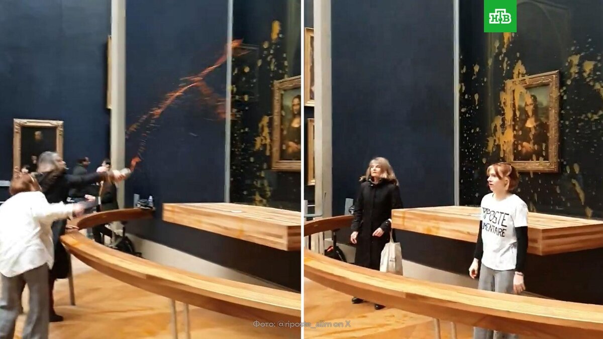 [ Смотреть видео на сайте НТВ ] Экоактивисты снова попытались испортить «Мону Лизу» в парижском Лувре. Сегодня две женщины проникли в Лувр и облили стенд с «Моной Лизой», предположительно, супом. Активистки в футболках с надписями Riposte Alimentaire («Продовольственный ответ») стали выкрикивать лозунги о важности «экологически чистого питания» и «больной сельскохозяйственной системе» Франции, а также облили коричневой жидкостью защитное стекло, закрывающее шедевр Леонардо да Винчи. Женщин остановили сотрудники Лувра, которые попросили посетителей покинуть зал. Картина не пострадала. Отметим, что экоактивисты не в первый раз покушаются на «Мону Лизу». Так, в мае 2022 года мужчина в инвалидной коляске попытался разбить защитное стекло, а потом измазал его тортом. [ Смотреть видео на сайте НТВ ]